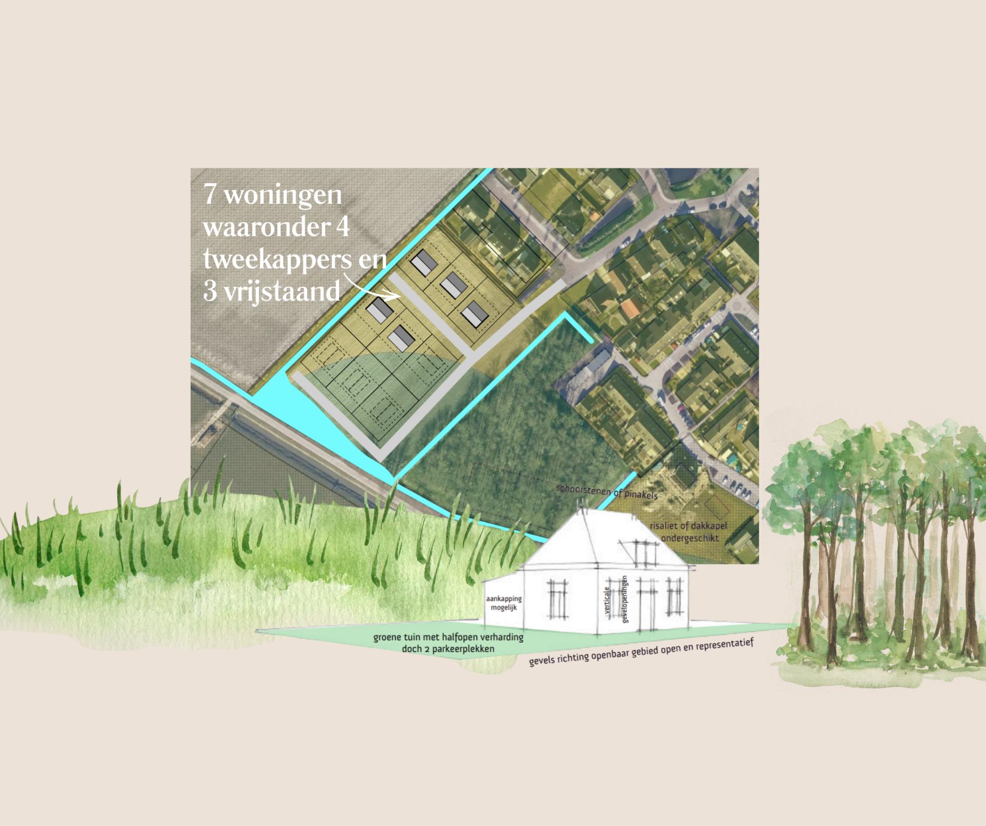 Er komen drie vrijstaande woningen en twee twee-onder-een-kapwoningen op kavels van circa 314 tot 662 m².